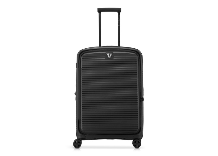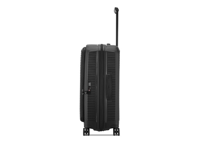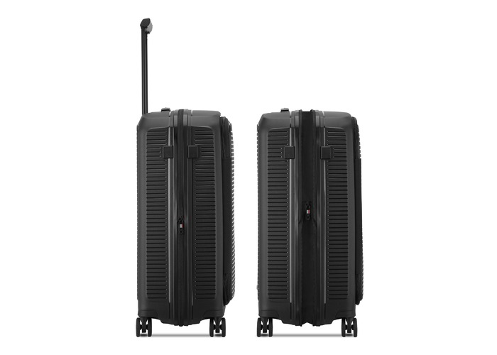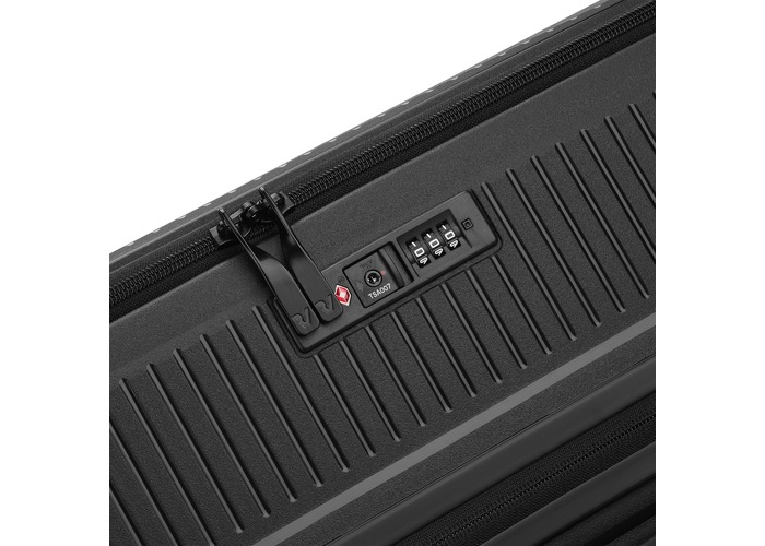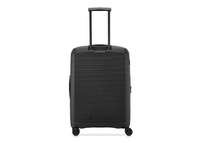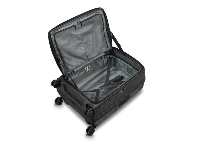 Валіза виготовлена з поліпропілену на 100% переробленого матеріалу, який пропонує: максимальну ударостійкість, надзвичайну міцність, оптимальну легкість, термостійкість. Оснащена 4 спареними і маневреними колесами. Для зручності переміщення передбачена еластична, підйомна пластикова ручка на верхній та бічній панелях, а також телескопічна ручка. Безпека і збереження багажу забезпечує вбудований кодовий замок з системою TSA. Серед найцінніших особливостей – інноваційна система FLAT TOP: кришка, що відкривається на 90° замість центрального отвору. Дизайн розроблений для зменшення об'єму та полегшення доступу до вмісту.
